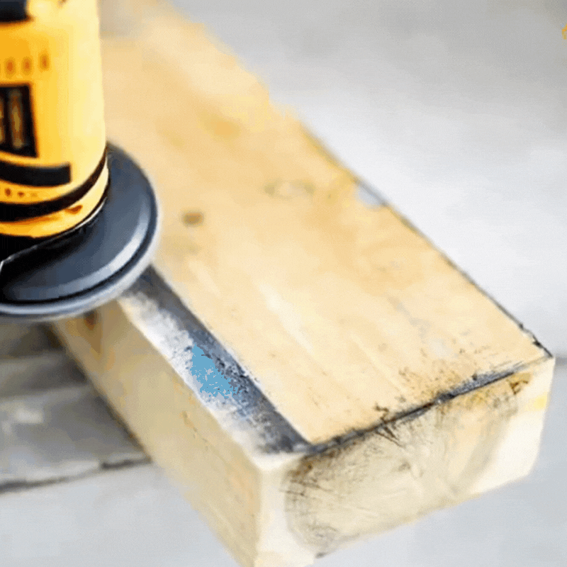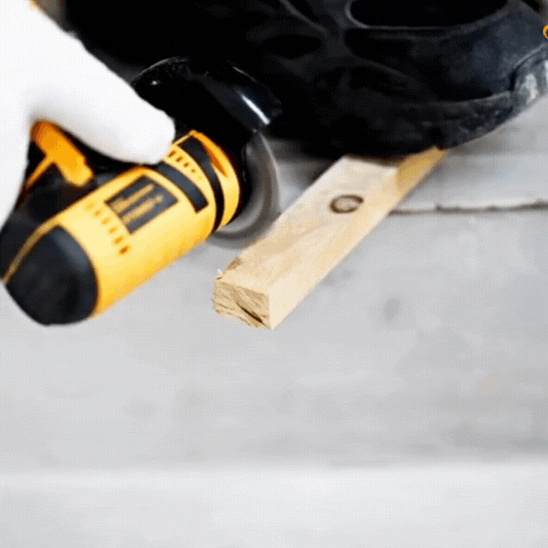 Úhlová bruska s bílými ochrannými rukavicemi na dřevotřískové desce, připravená k řezání kovu nebo kamene.