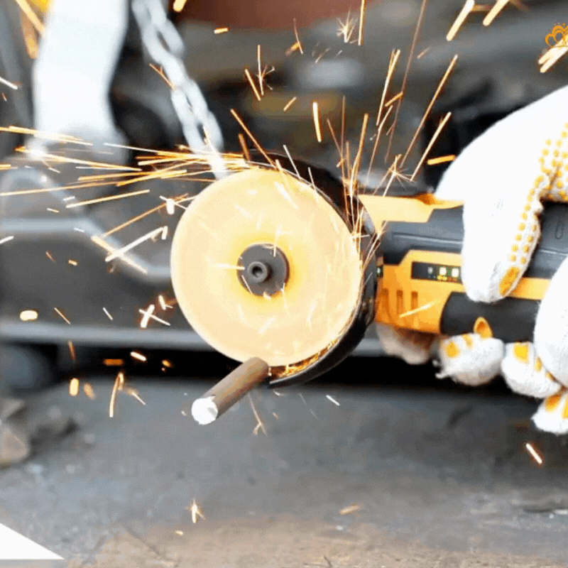 Úhlová bruska v pohybu, která řeže ocelový materiál a produkuje jasné jiskry při práci, přičemž je v rukavicí chráněné ruce.