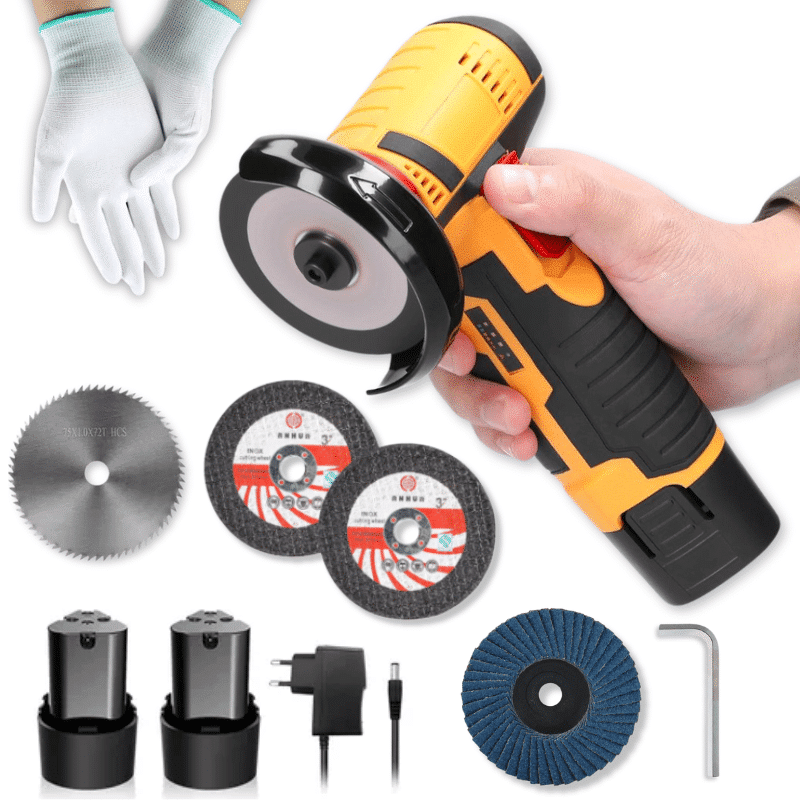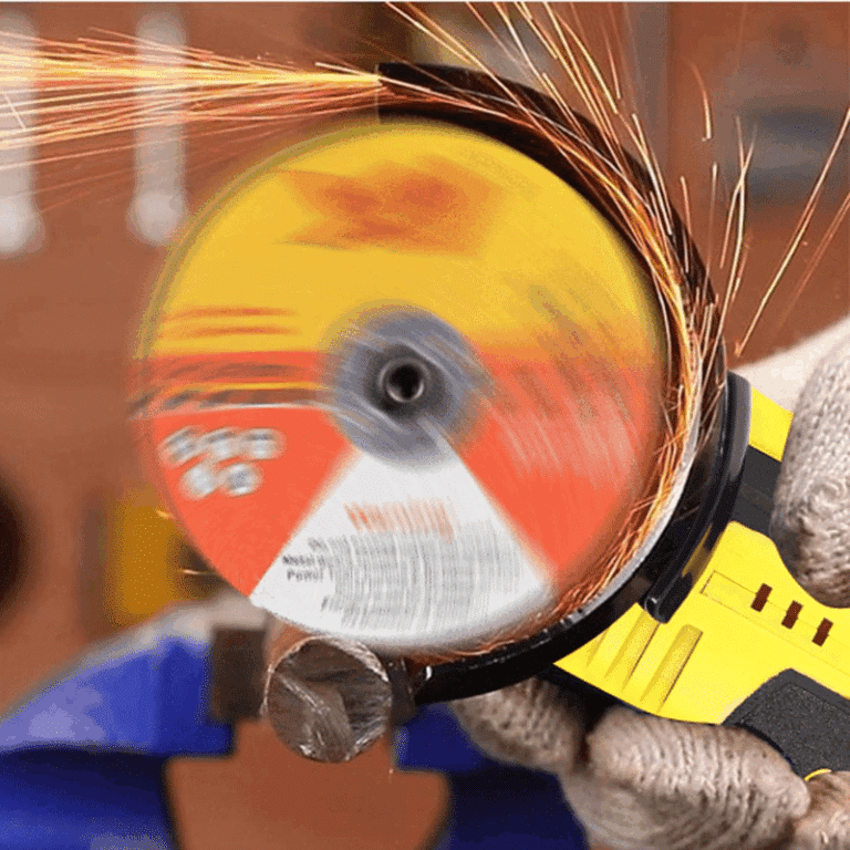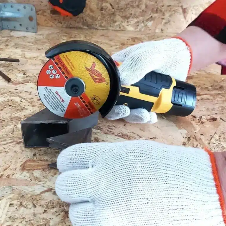 Úhlová bruska s bílými ochrannými rukavicemi na dřevotřískové desce, připravená k řezání kovu nebo kamene.