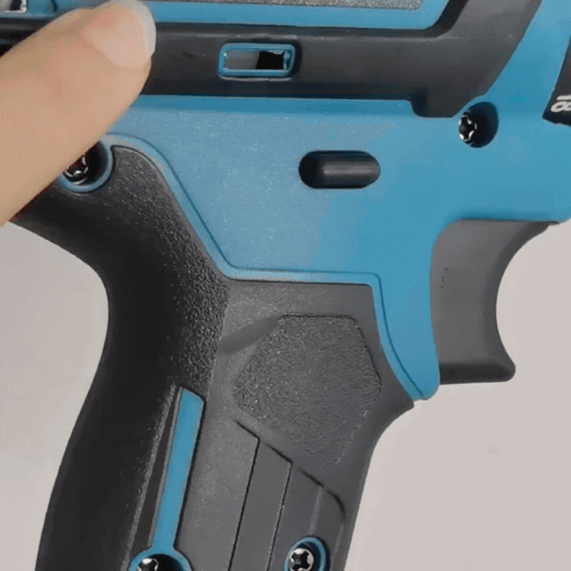 Detailní černobílý pohled na černou vrtačku s modrým prvkem, zaměřený na tělo a hlavici nástroje v éterickém osvětlení.