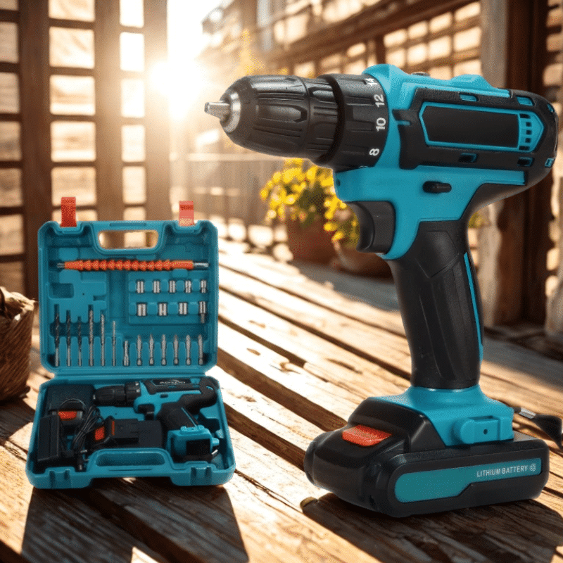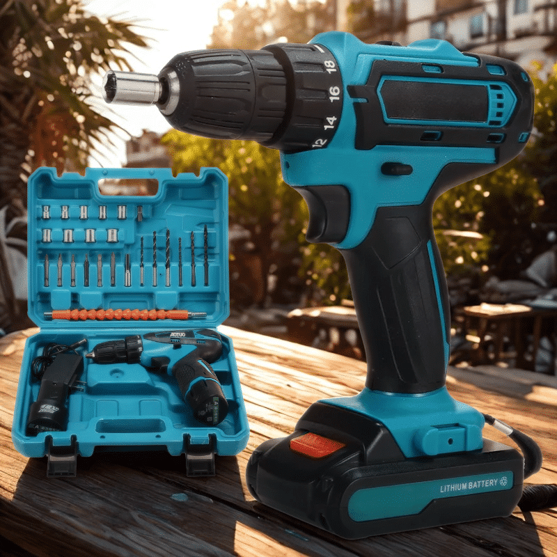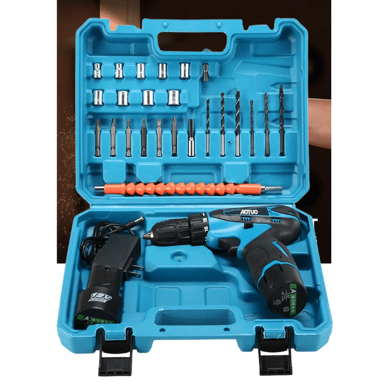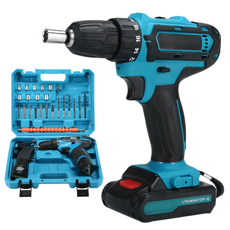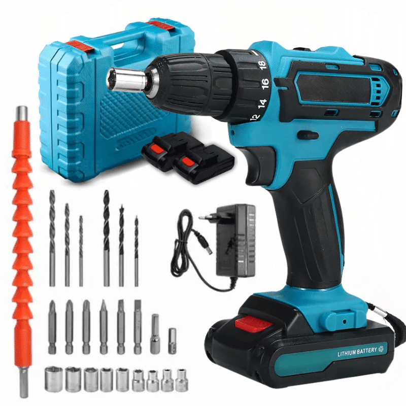 Modrá aku vrtačka v sadě s modrým kufříkem, nabíječkou, lithiovou baterií a sadou vrtáků a bitů v modro-černém provedení.
