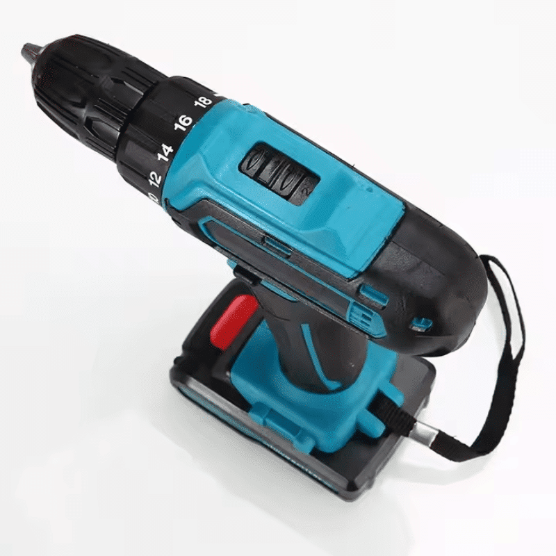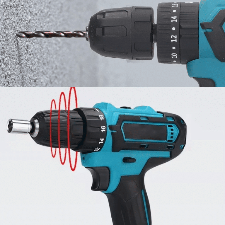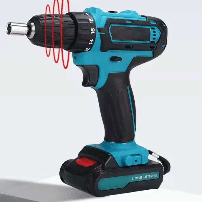 Modrý bezšňůrový akumulátorový vrtací šroubovák s černými prvky, zobrazený ve dvou pohledech s vrtákem a červenými vlnkami znázorňujícími rotaci.