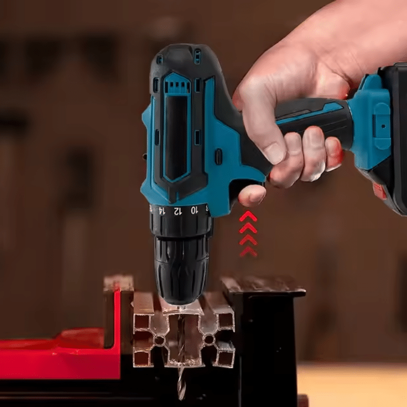 Modrá akumulátorová vrtačka v ruce, která vrtá do černého konstrukčního profilu s červeným úchytem na pracovním stole.