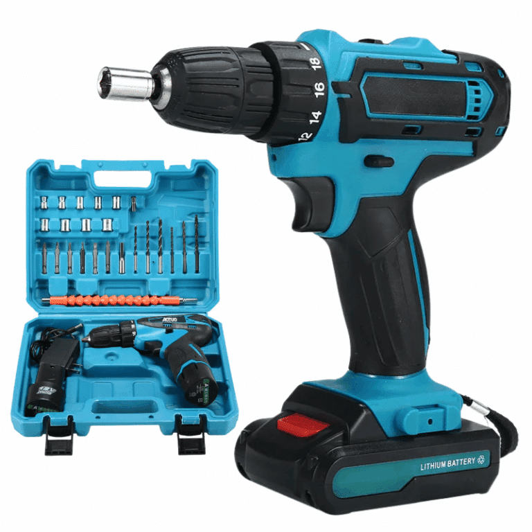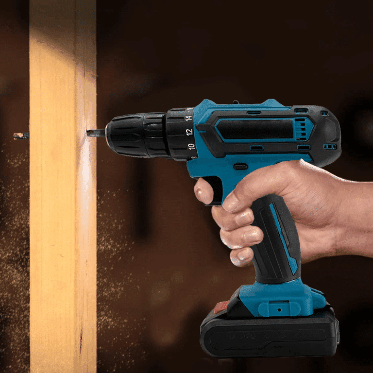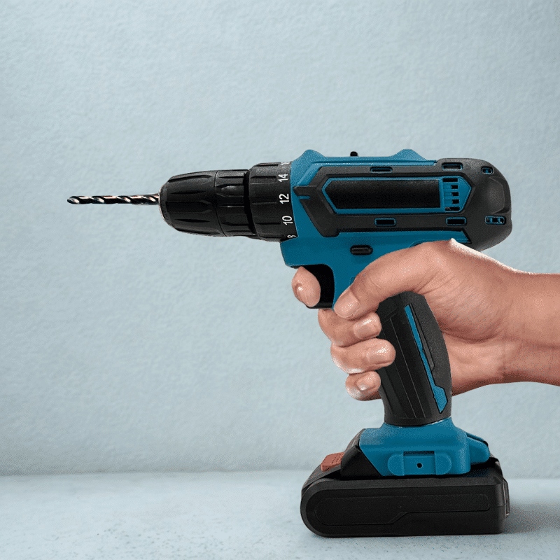 Modrý akumulátorový šroubovák s vrtákem, držený rukou na světle modrém pozadí, vedle černé dobíjecí baterie.