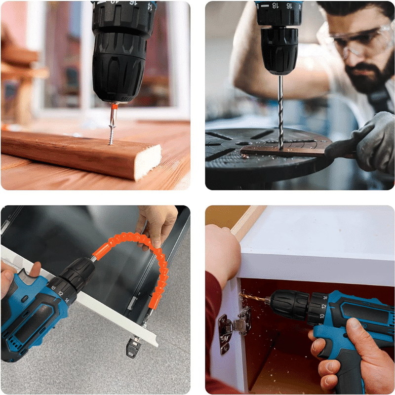 Čtyři obrázky ukazující použití elektrické vrtačky v různých řemeslných a průmyslových aplikacích, včetně vrtání do dřeva, kovu a montáže součástí.