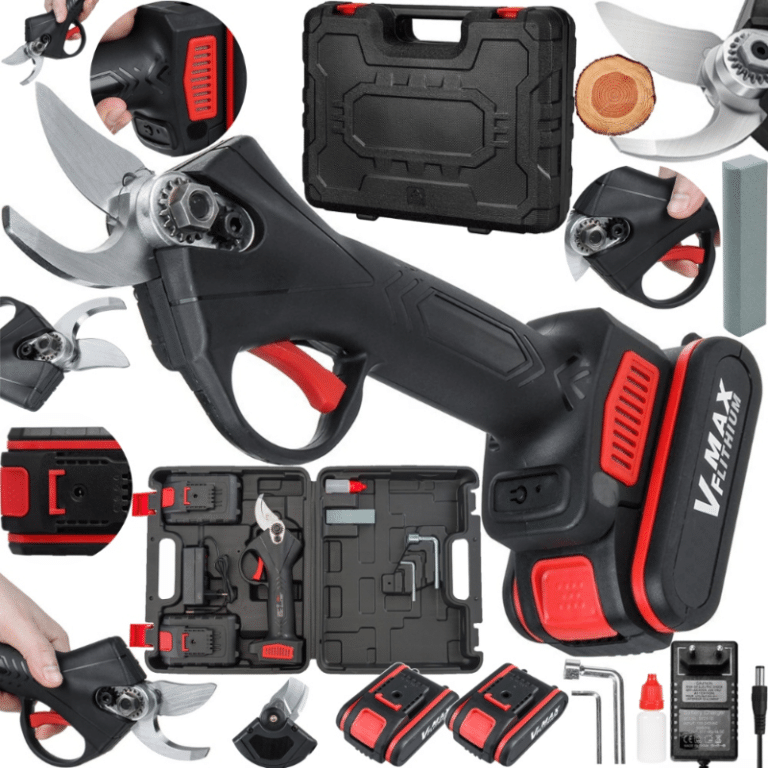 Elektrické zahradní nůžky na větve s 21V baterií, černočervené barvy, určené pro snadné stříhání a řezání zahradního porostu.