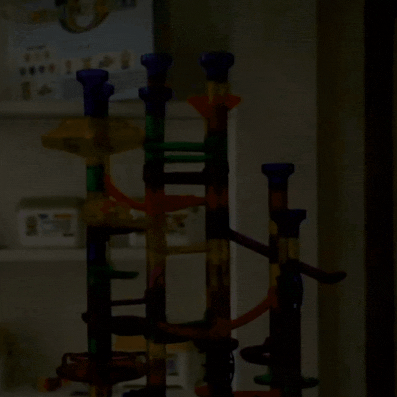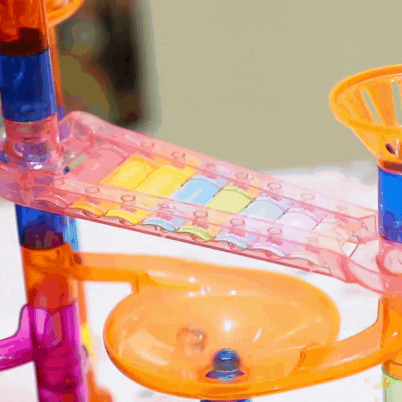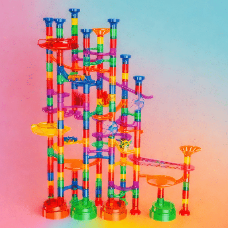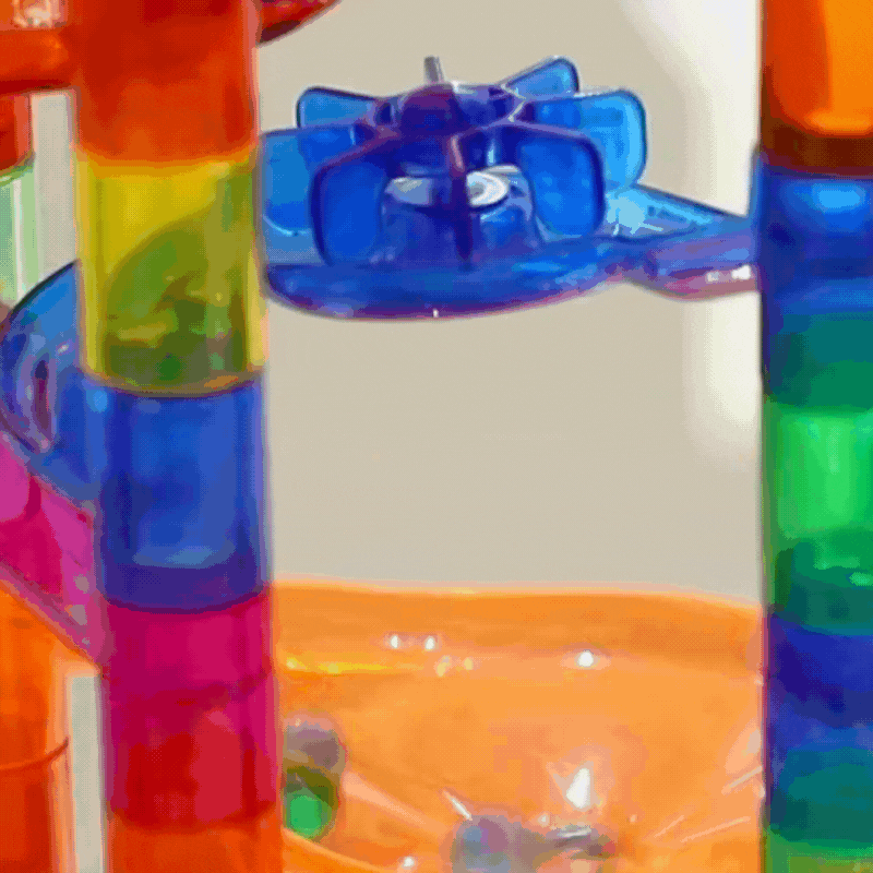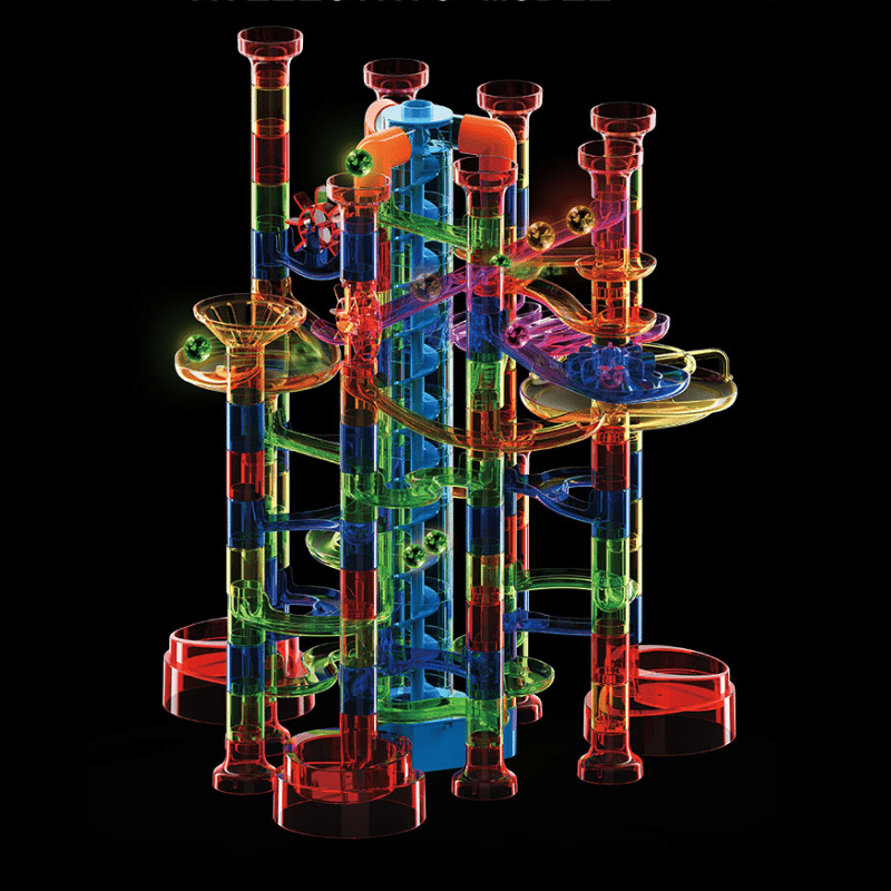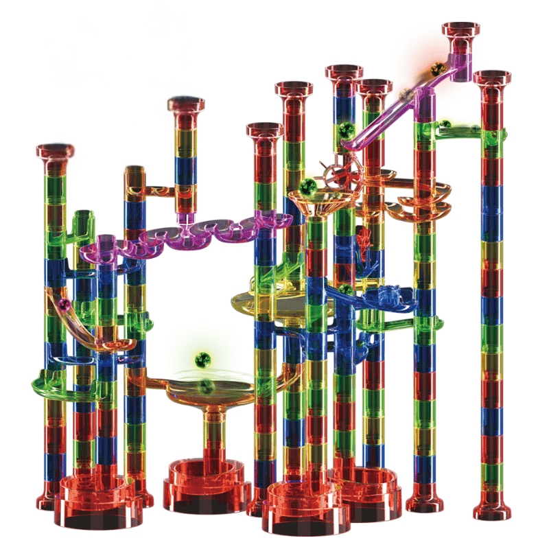 Barevná věž z plastových dílů určená pro marble run, skládající se z průhledných barevných trubek a drah, po kterých se pohybují malé kuličky v různých směrech.
