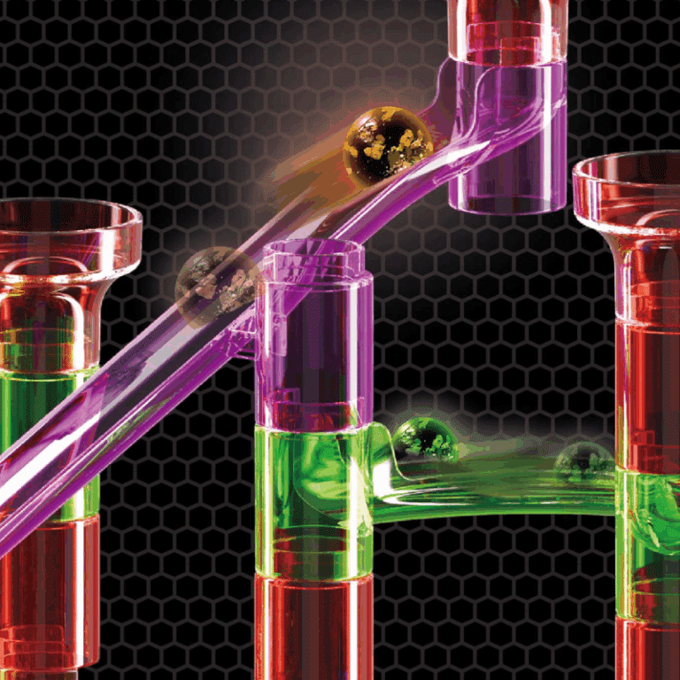 Počítačová grafika znázorňující barevné skleněné trubice a kuličky v zelené, růžové a červené barvě na černém hexagonálním pozadí, připomínající abstraktní laboratorní nebo herní prostředí.