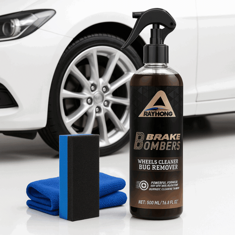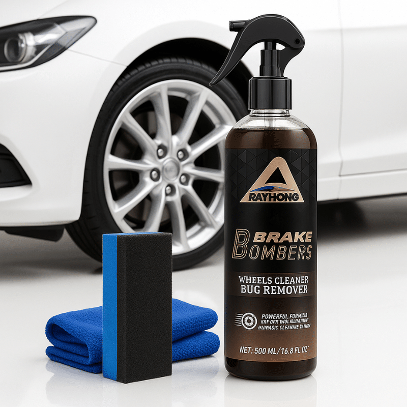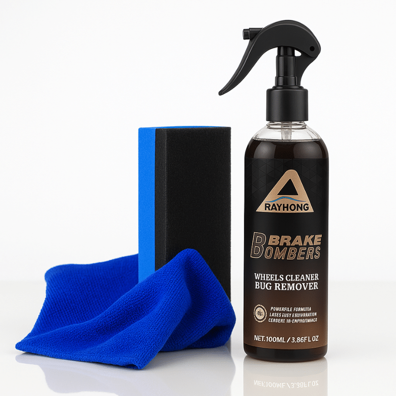 Sprej Rayhong Brake Bombers na čištění kol a odstraňování hmyzu, tmavá láhev s rozprašovačem a modrá čisticí utěrka na bílém pozadí.