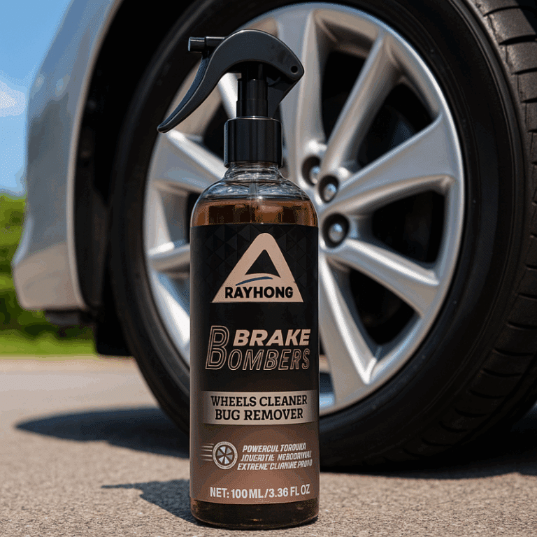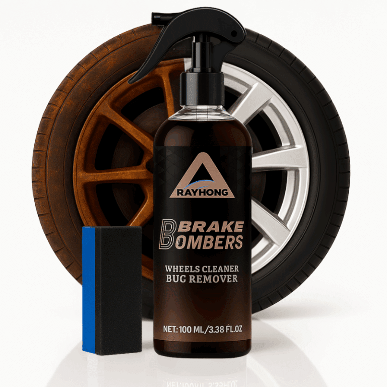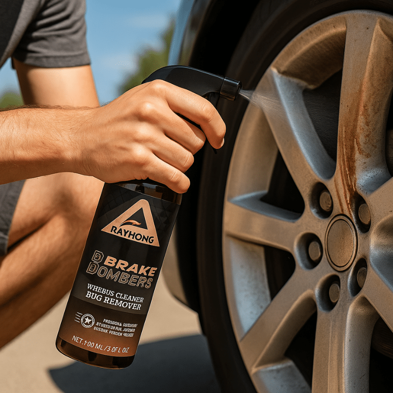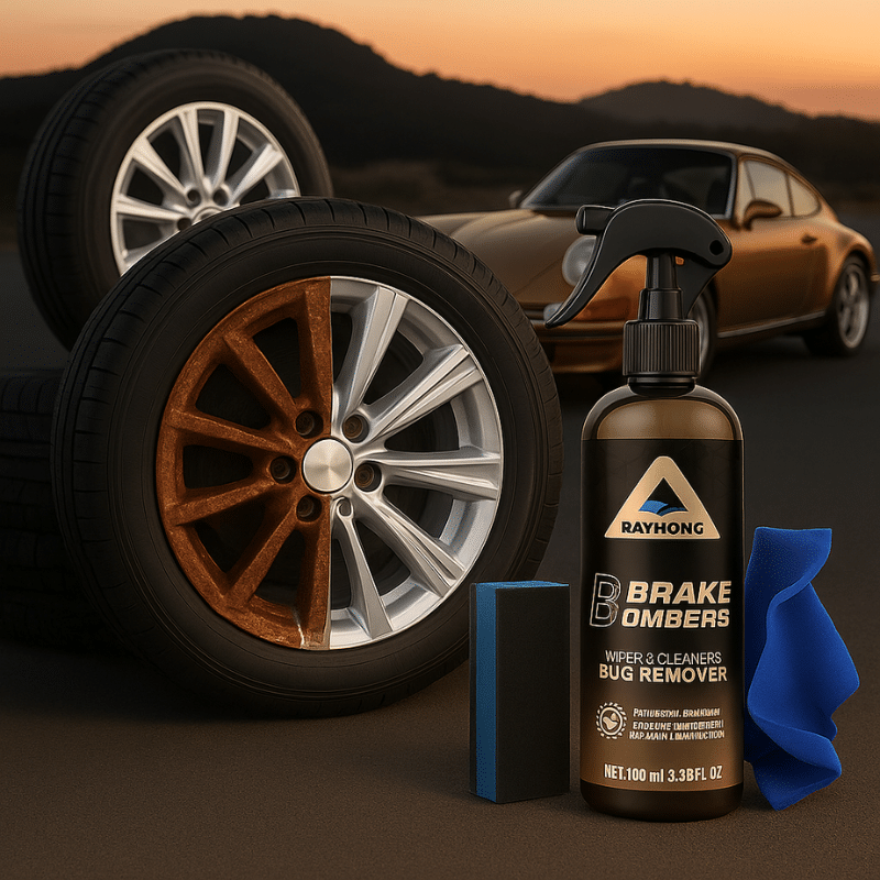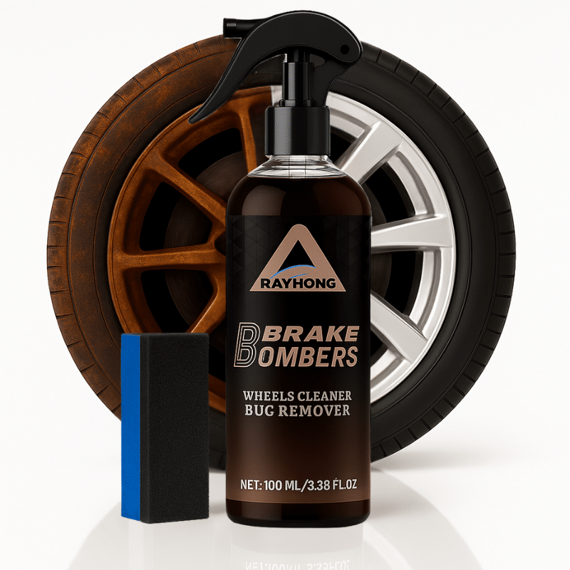 Reklamní fotografie produktu Rayhong Brake Bombers, čisticího spreje na kola automobilu, umístěného mezi znečištěným a čistým automobilovým diskem kola.