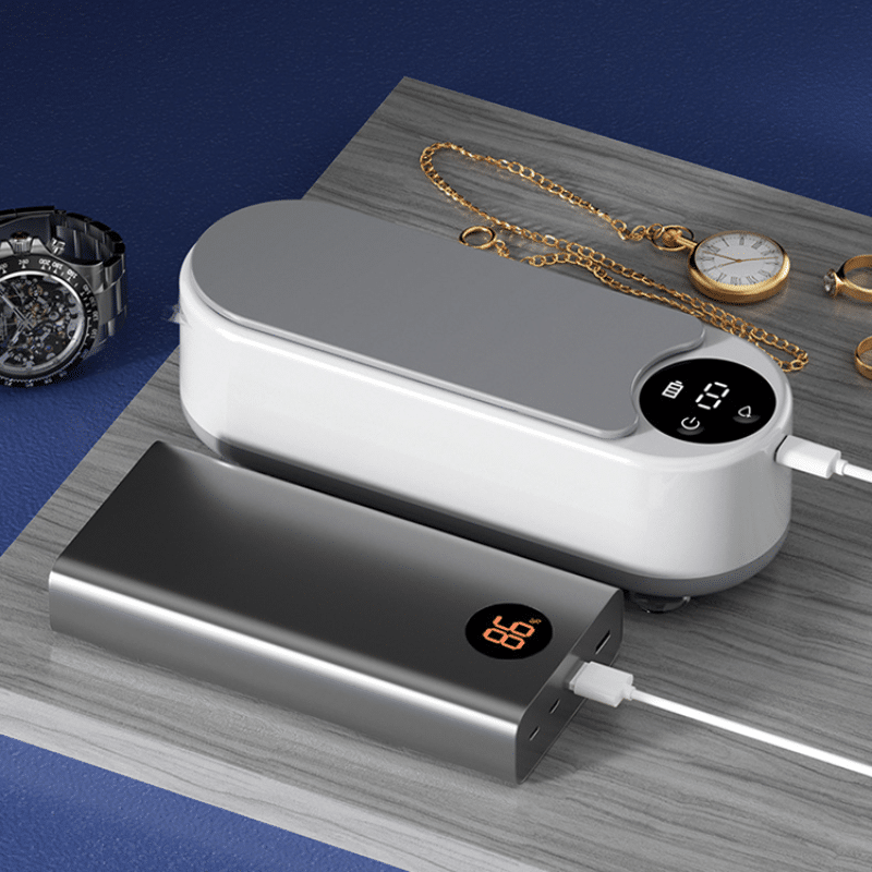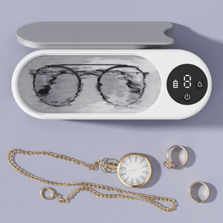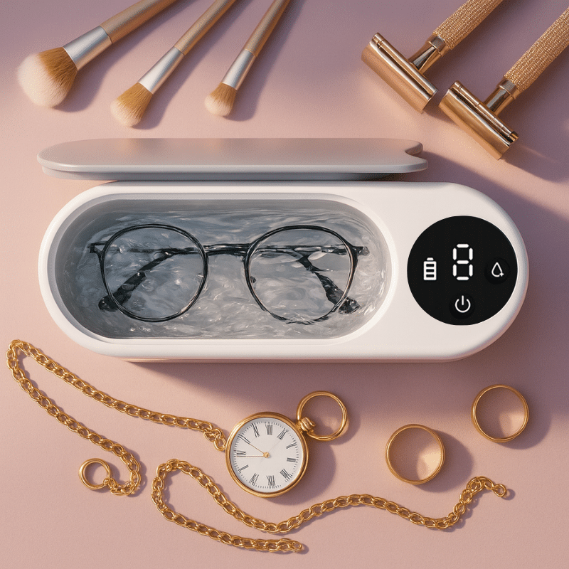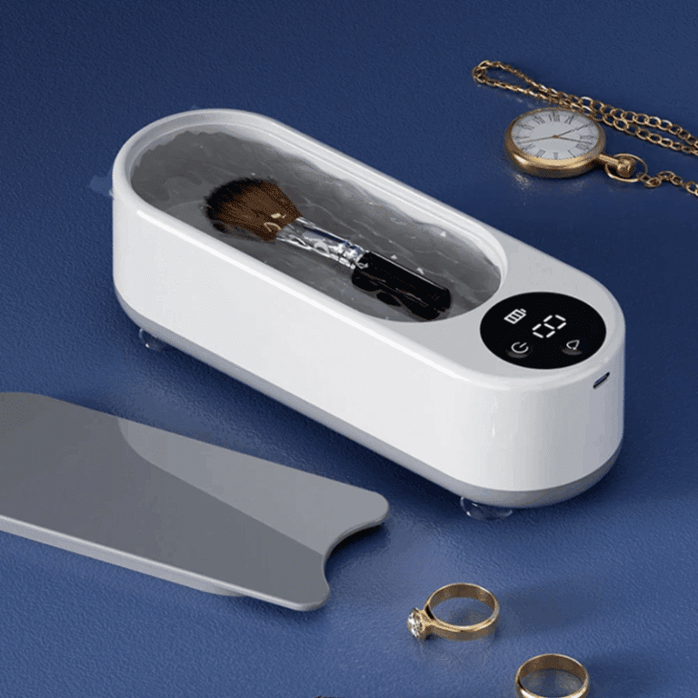 Bílý ultrazvukový čistič s digitálním displejem, v němž je ponořený štětec, vedle leží zlaté prsteny a kapesní hodinky na modrém pozadí.