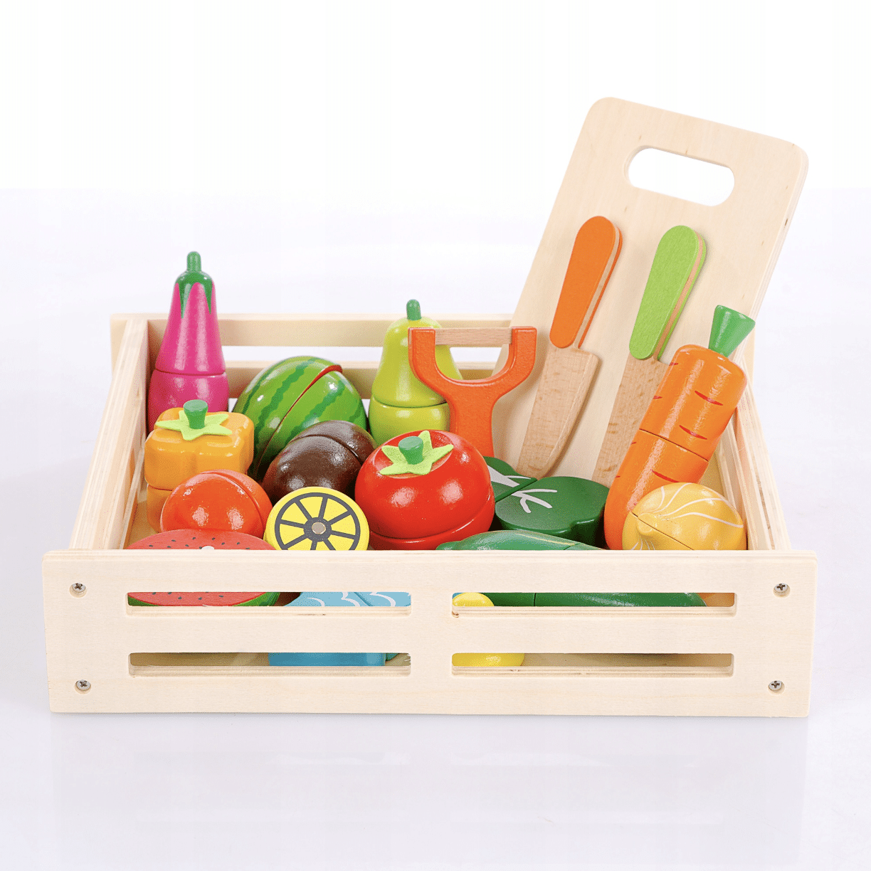 V praktické dřevěné bedýnce najde dítě vše, co potřebuje každý malý kuchař. Jednotlivé potraviny jsou spojeny magnety, takže je lze snadno „krájet“ a znovu skládat dohromady.