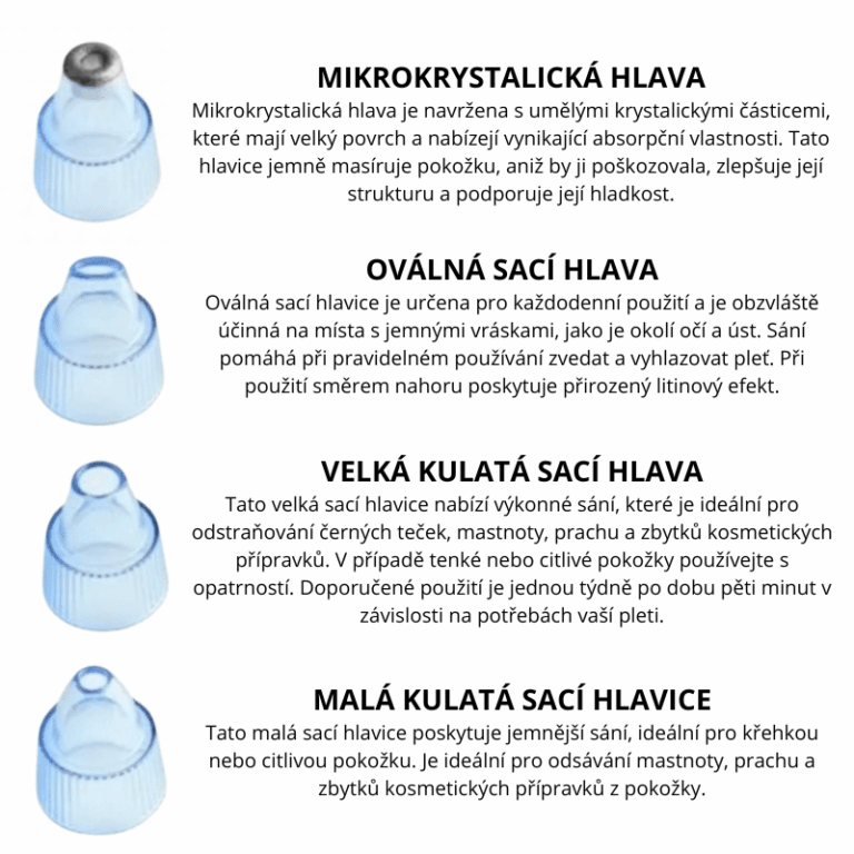 Čtyři typy kosmetických sacích hlavic v modrobílém provedení s podrobným popisem jejich využití a vlastností pro péči o pleť.
