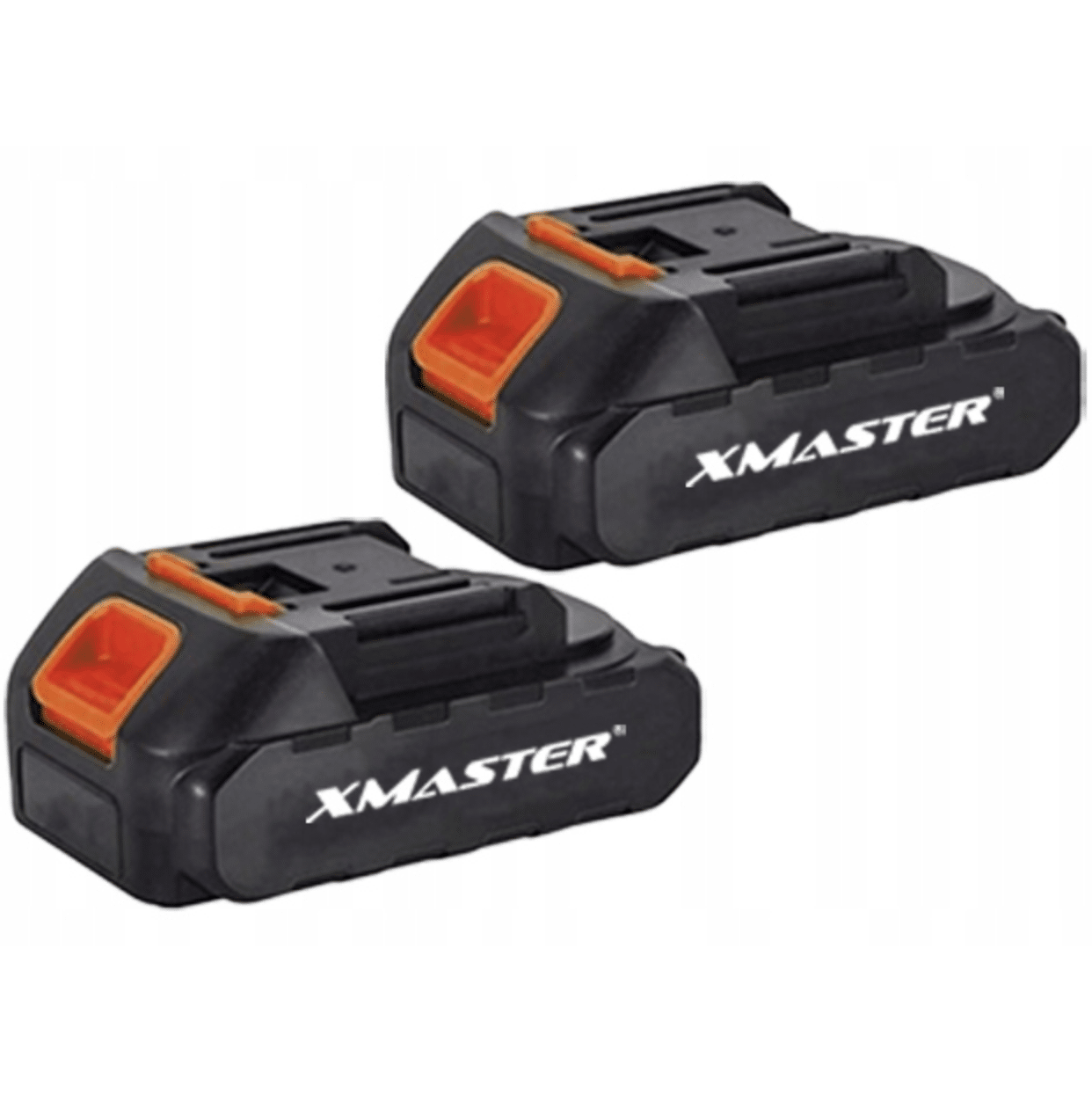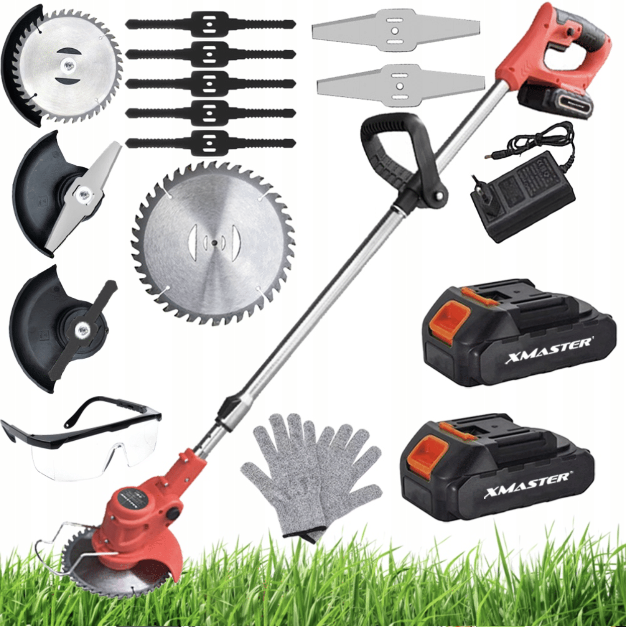 Sada elektrického zahradního nářadí XMaster včetně aku vyžínače, náhradních řezacích kotoučů, ochranných pomůcek a dobíjecích baterií, určená pro údržbu travnatých ploch.