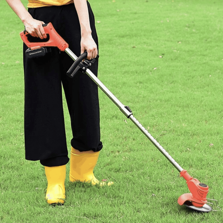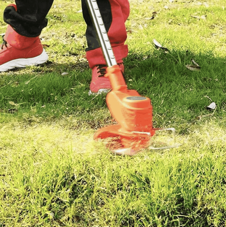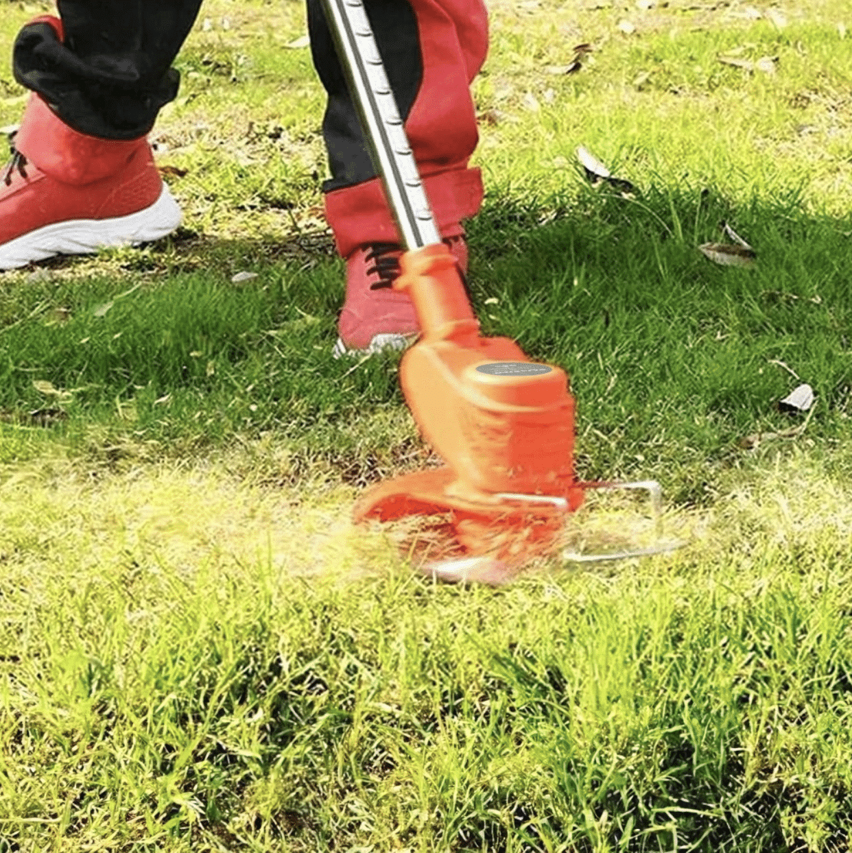 Sekání trávy pomocí elektrické strunové sekačky v oranžové barvě, zachycené v pohybu na zelené trávě s několika padlými listy.