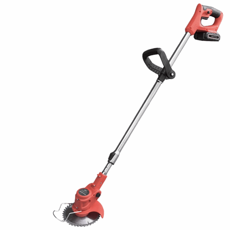 Červený akumulátorový vyžínač s kovovým řezacím kotoučem, určený pro sečení trávy a lehké zahradní práce.