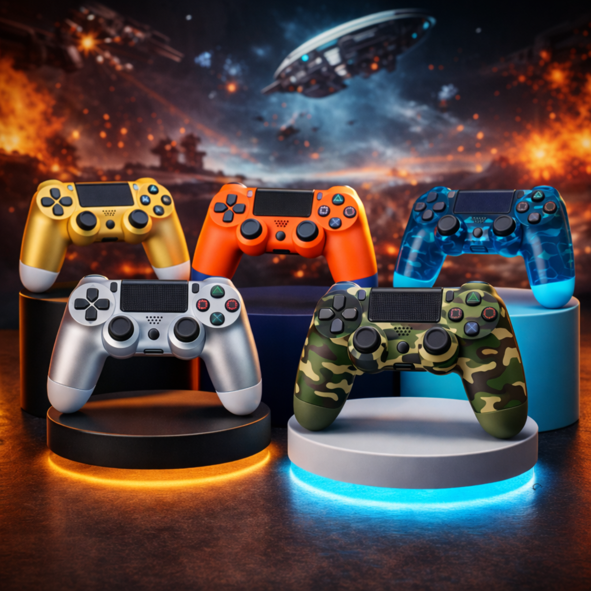 Dva herní ovladače PlayStation 4 v modré průsvitné a maskáčové zelené barvě, umístěné vedle sebe na bílém pozadí.